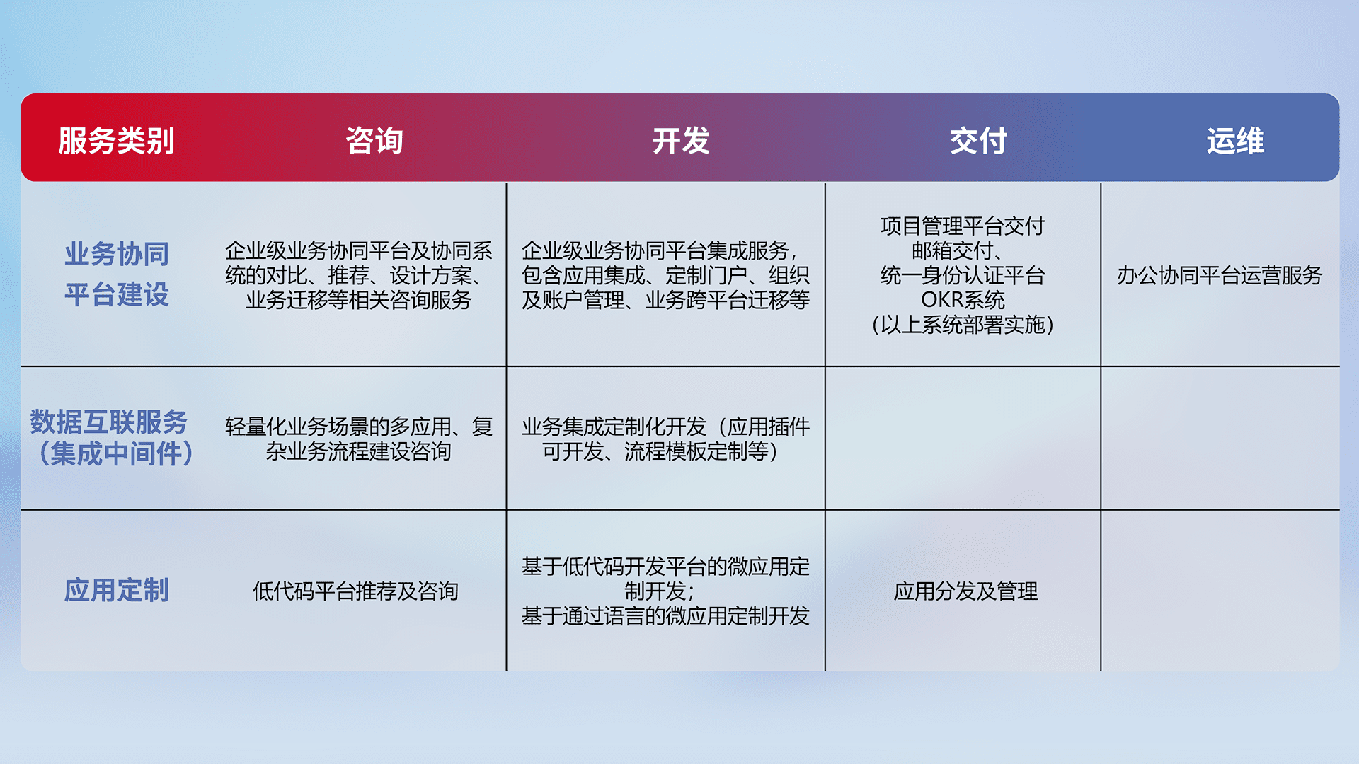 针对钉钉、、企微、、、IDaas等平台级产品提供产品的规划、、、、方案、、、交付、、、定制化开发等服务,,,实现如统一协同办公、、智能客户服务、、、混合会议管理、、智能数据查询、、等业务场景,,实现数字化转型。。。