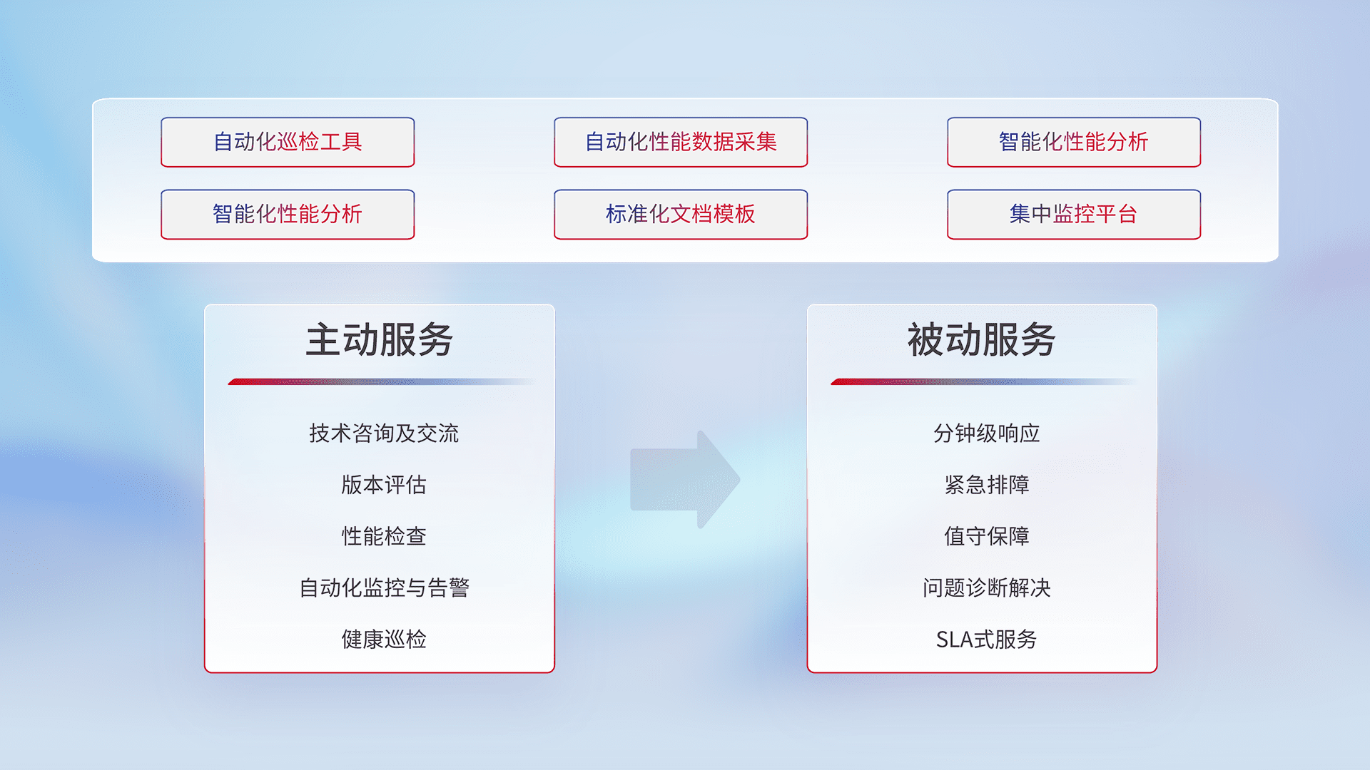 智能化工具和标准化文档,,,保障服务质量,,,提供主动服务(包含技术咨询、、、、版本评估、、、、性能检查、、自动化监控与告警、、健康巡检)和被动服务包含(分钟级响应、、、紧急排障、、值守保障、、、问题诊断解决、、、、SLA服务)。。。