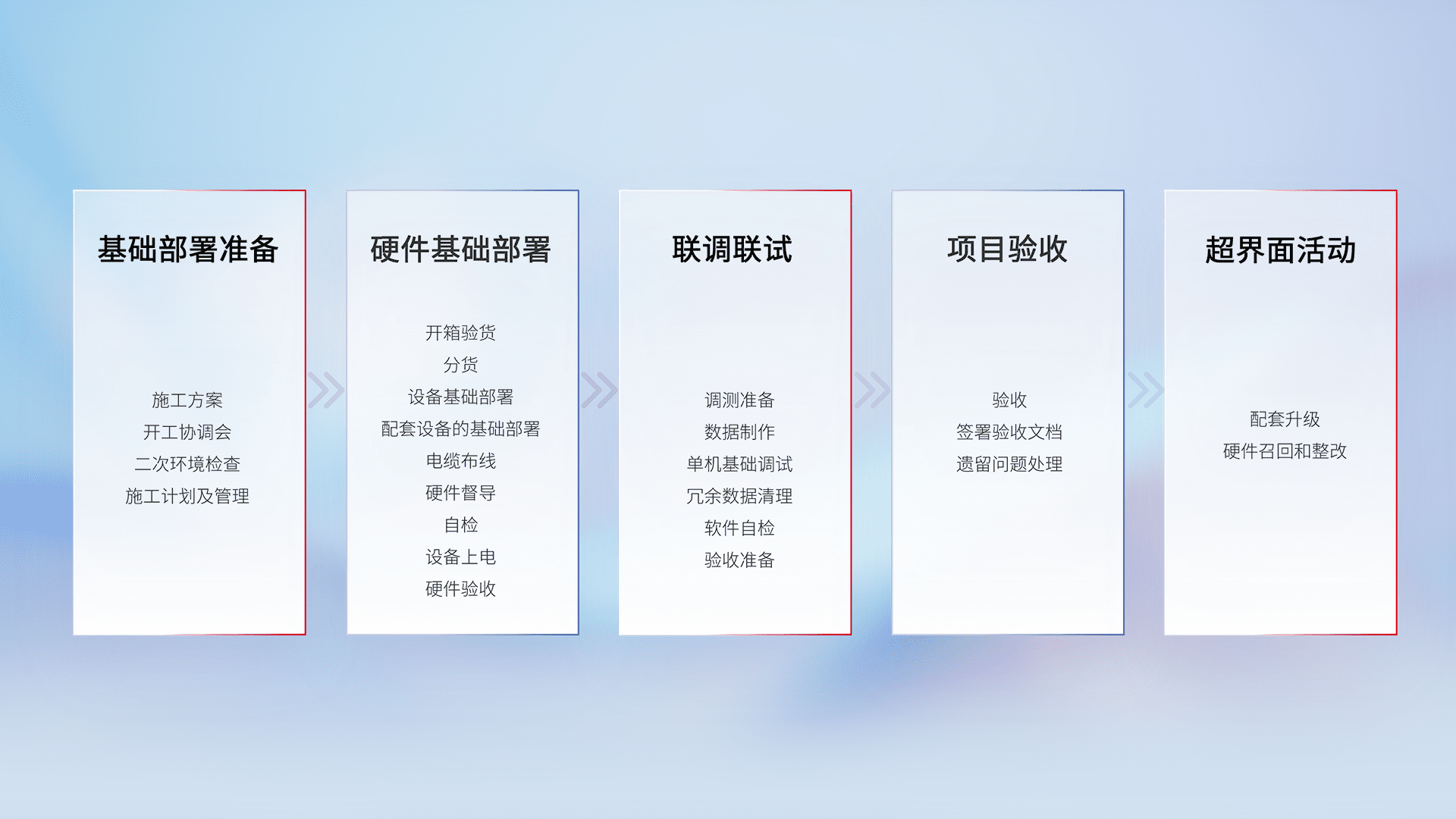 从基础部署准备、、、硬件基础部署、、、、联调联试、、、项目验收、、、越界面活动的全过程可追溯,,,保证施工质量和进度。。。